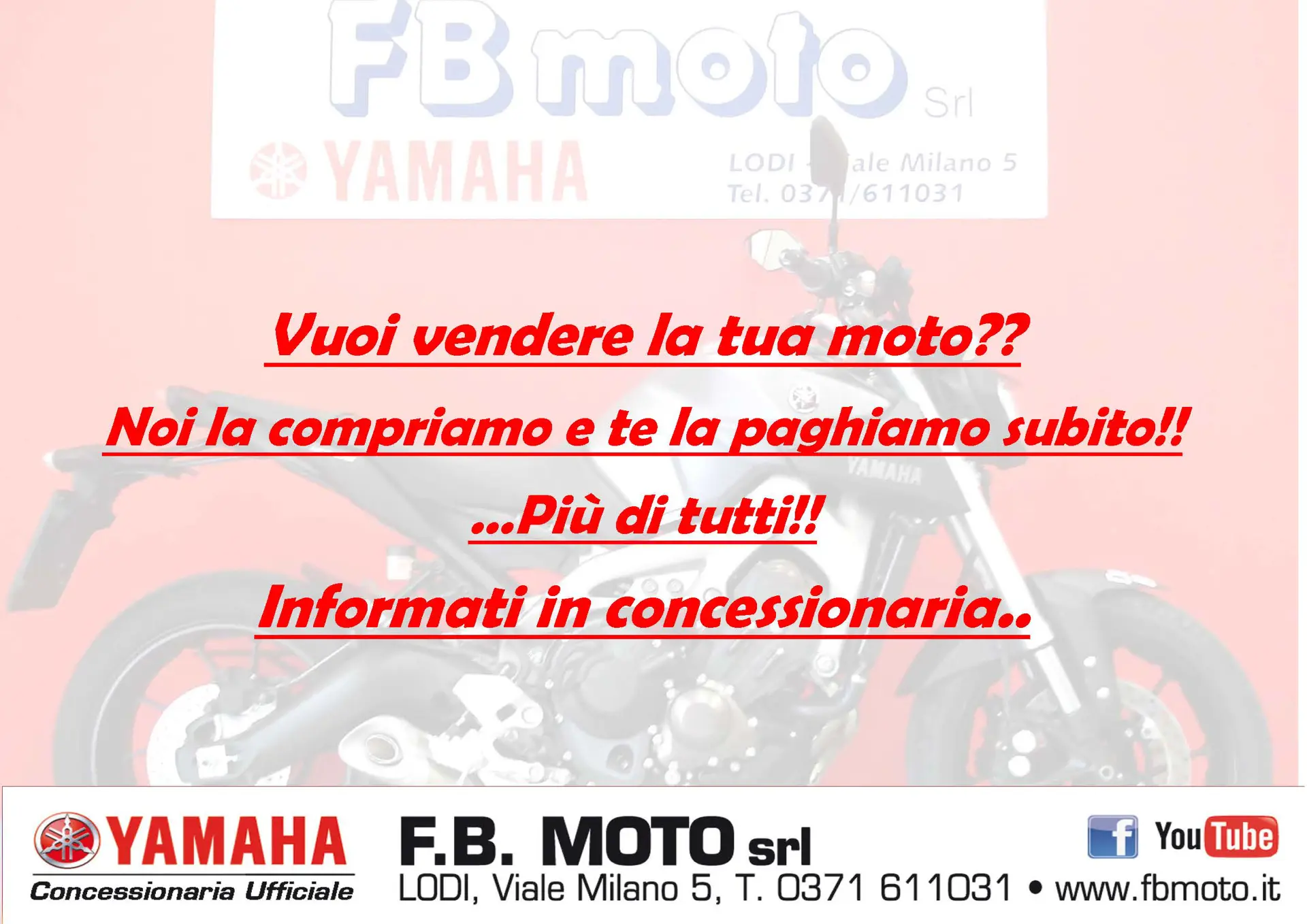 Se hai una moto in permuta inviaci le foto e la descrizione della tua moto usata al servizio Whatsapp 3357004618, ti invieremo il nostro miglior preventivo. Pagamenti personalizzabili anche dell'intero importo con prima rata posticipata oppure canone di guida con valore futuro, tutti a tasso agevolato. Assicurazione RCA, Furto/Incendio ed altre garanzie in concessionaria con attivazione immediata. Possibilita' di trasporto in tutta Italia, isole comprese, con consegna al domicilio. Personalizzazioni estetiche e tecniche presso il nostro servizio post-vendita. Reparto dedicato a caschi e abbigliamento per il motociclista. Acquistiamo moto e scooter usati con pagamento immediato e pratiche burocratiche a nostro carico. Le foto sono tutte originali fatte nel nostro show-room e le moto sono tutte di nostra proprieta' in pronta consegna. La moto si trova nella sede di Lodi Viale Milano,5. Responsabile Vendite: Daniele 0371-611031 / info@fbmoto.it