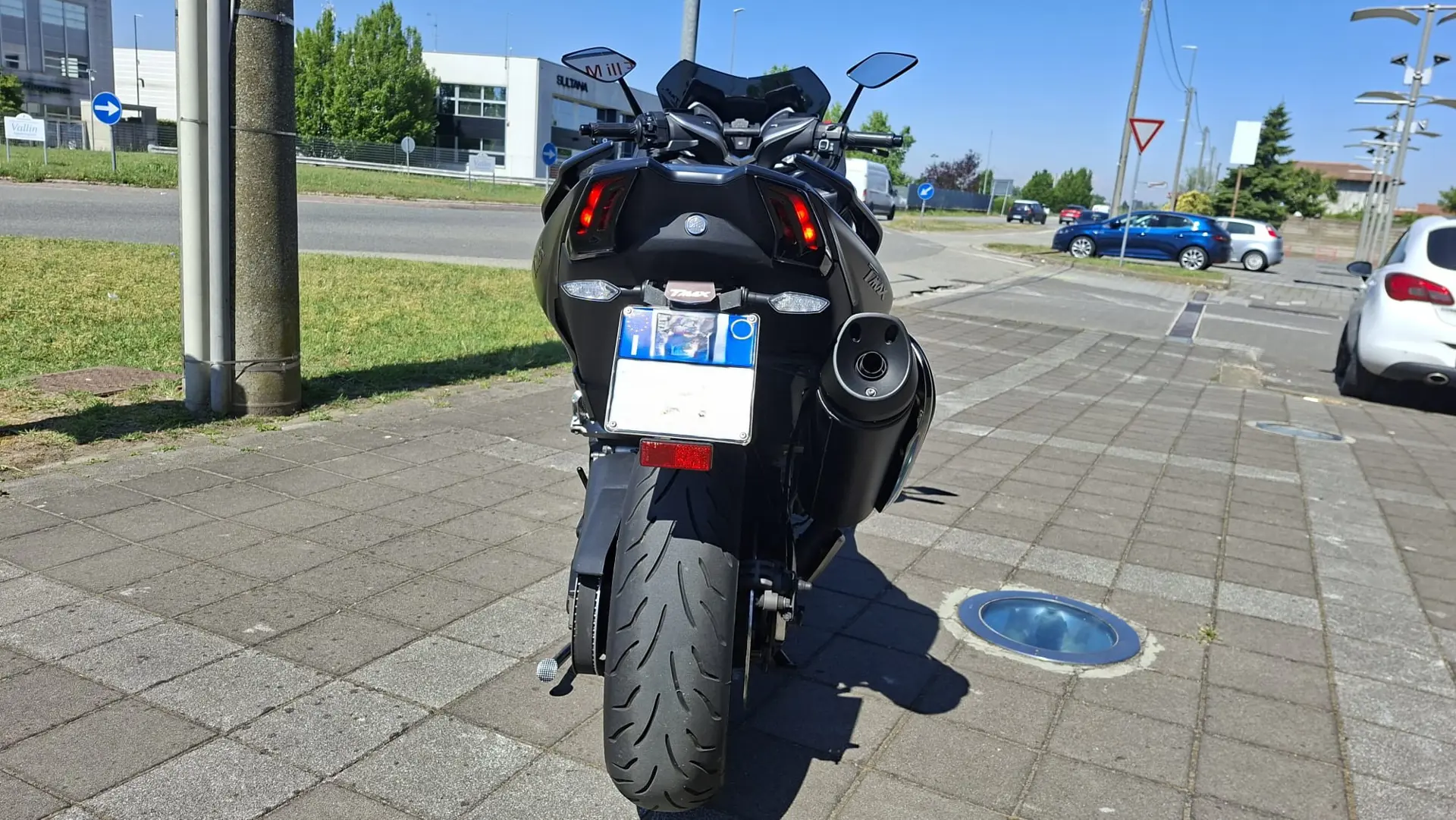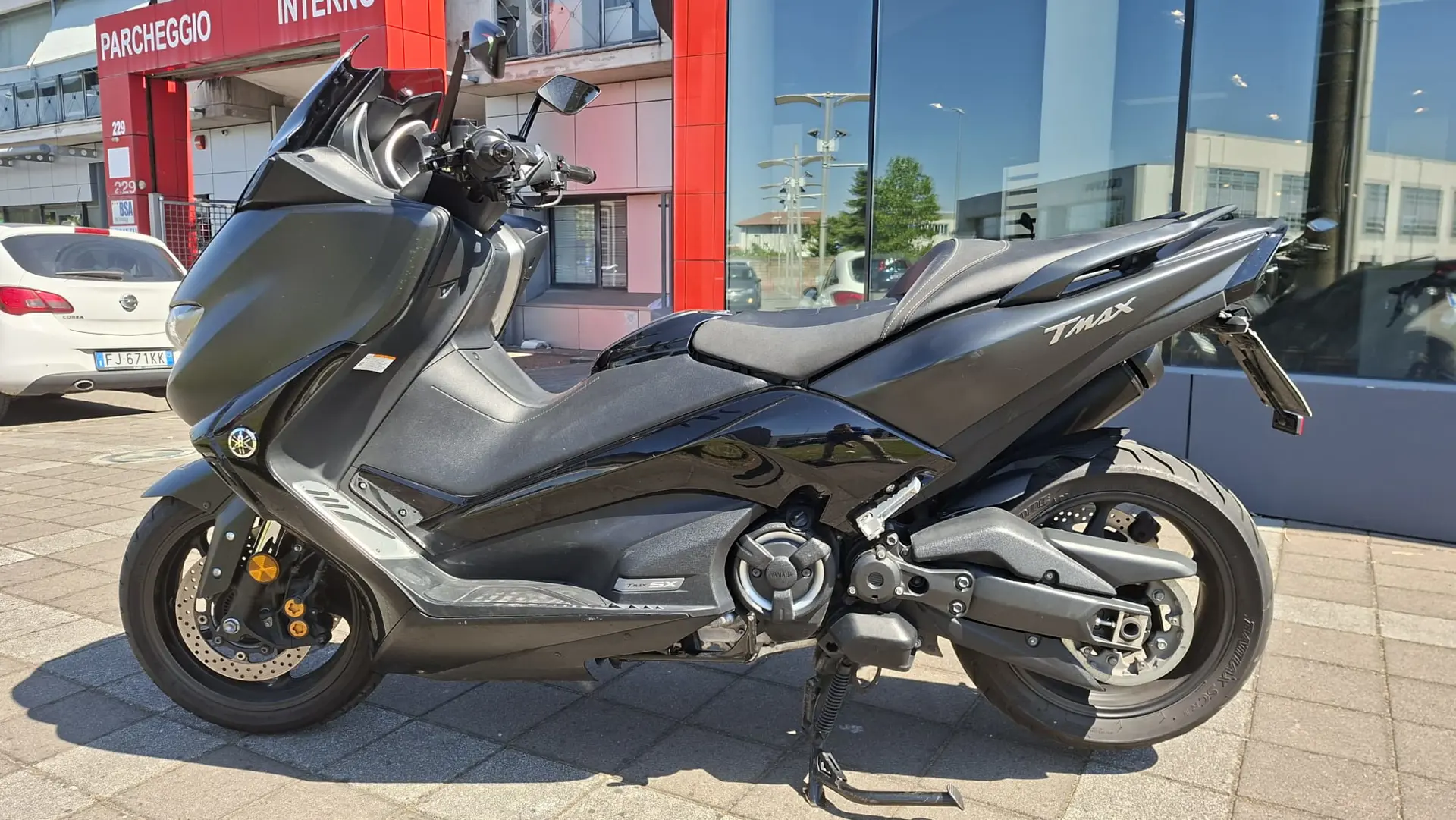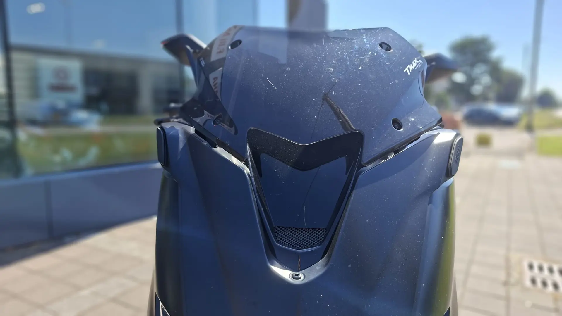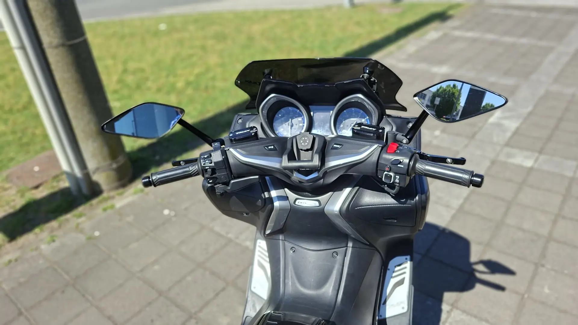 Yamaha T-Max 530 SX, monta numerosi optionals tra cui supporto telefono, cupolino fumè, portatarga sportivo, specchietti a manubrio e altri dettagli estetici
