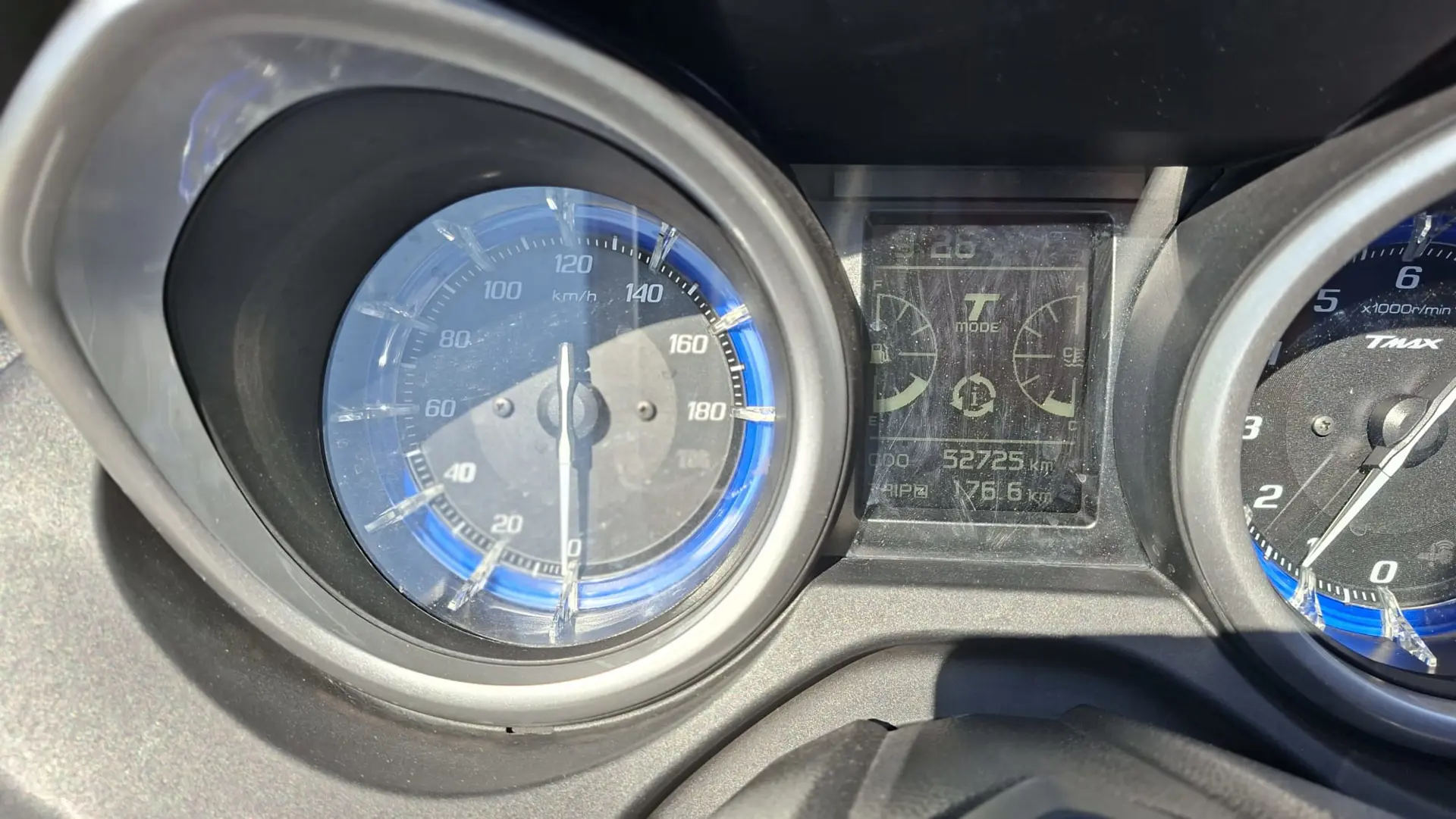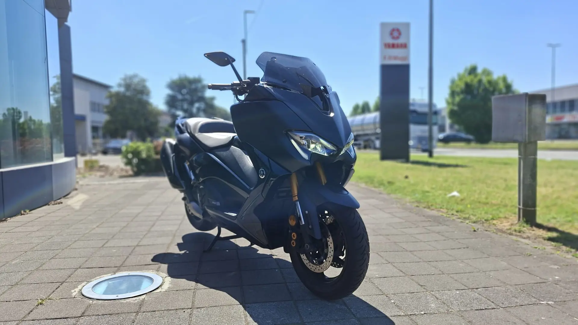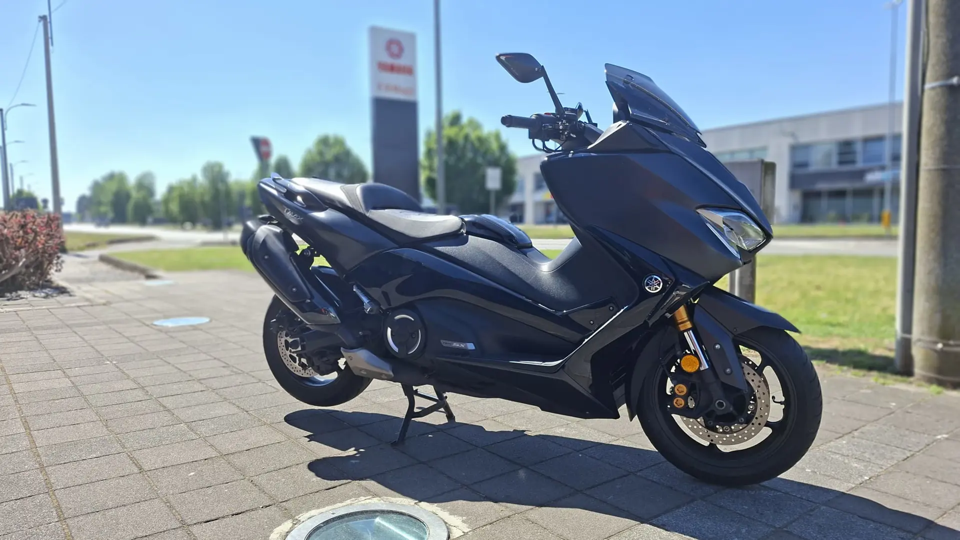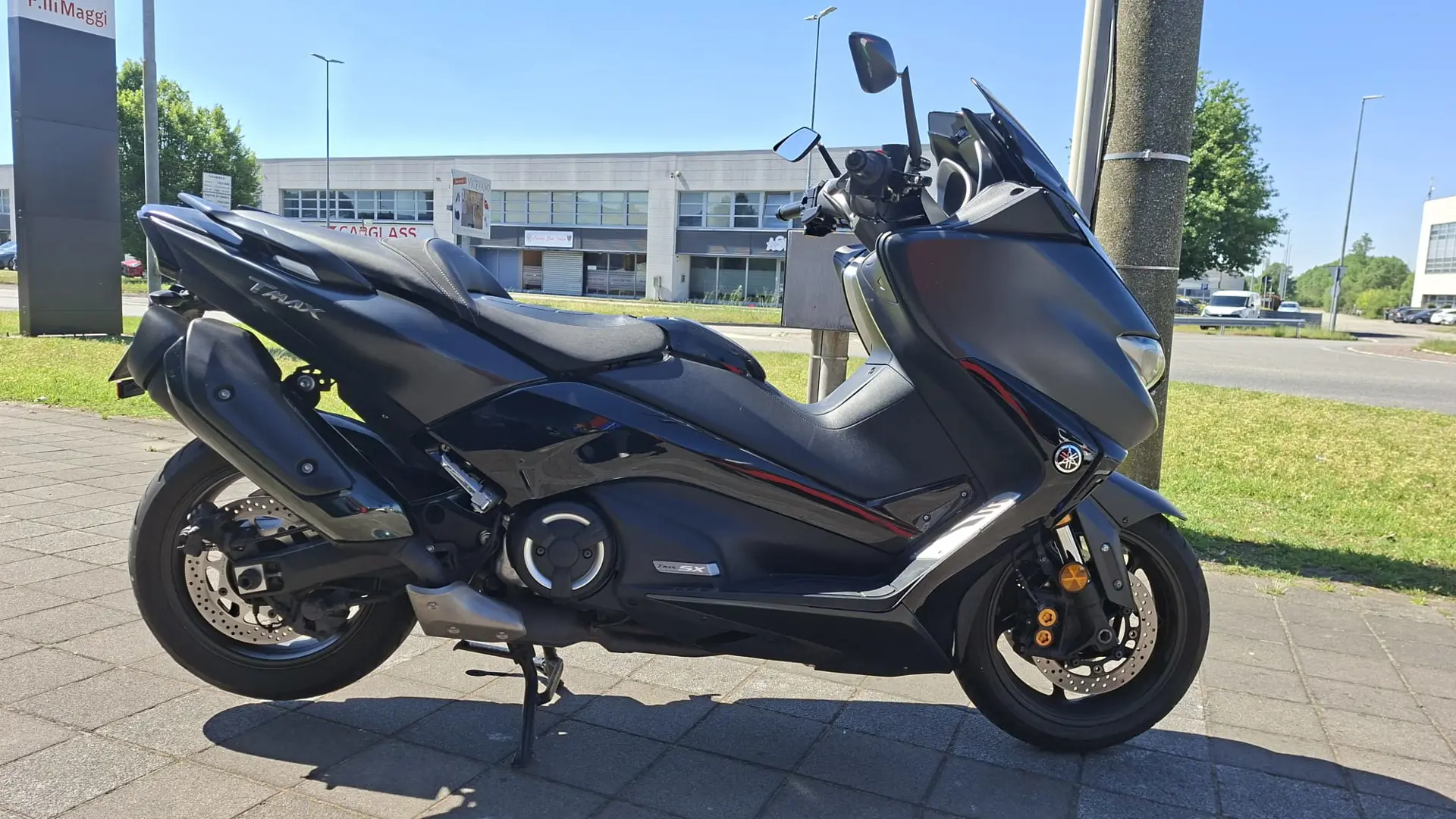 Yamaha T-Max 530 SX, monta numerosi optionals tra cui supporto telefono, cupolino fumè, portatarga sportivo, specchietti a manubrio e altri dettagli estetici