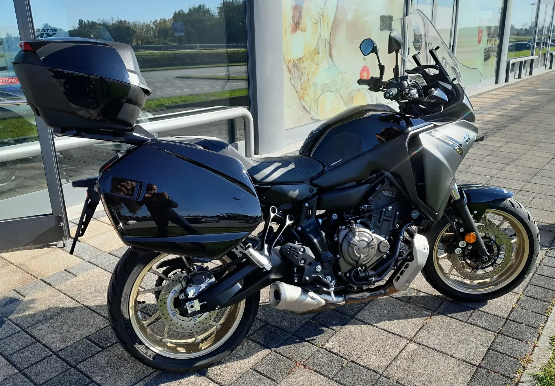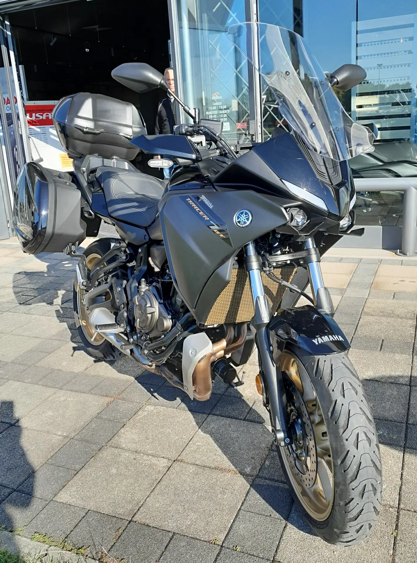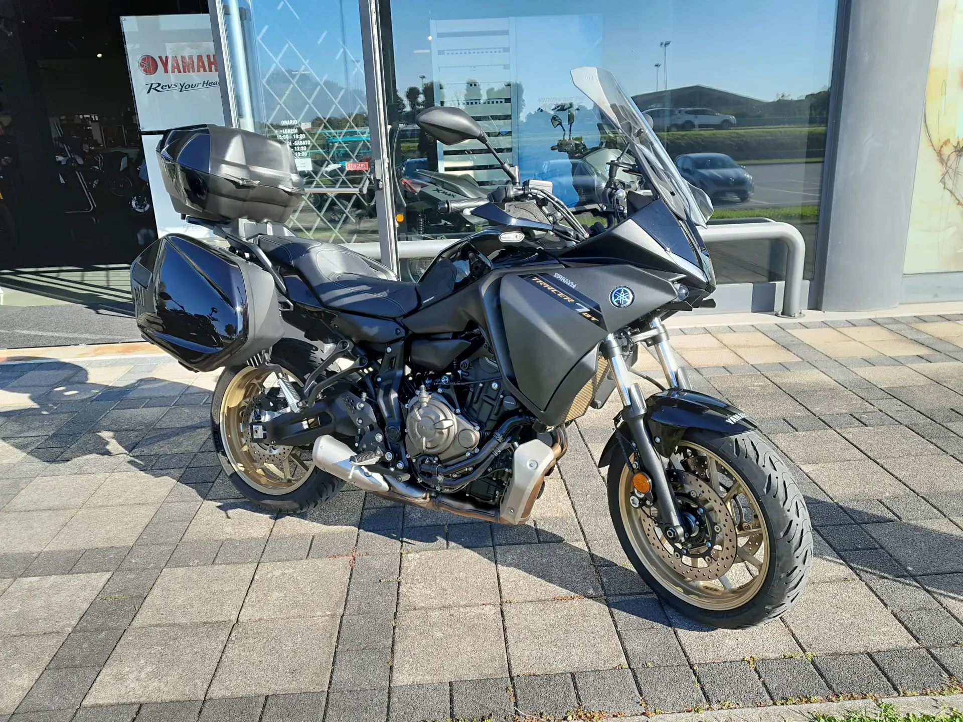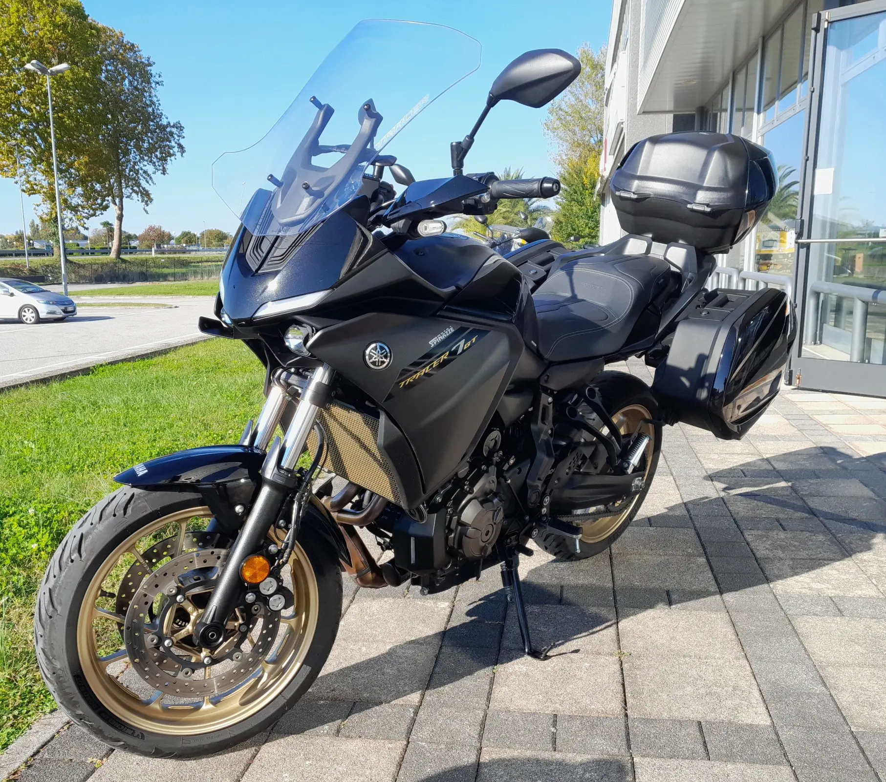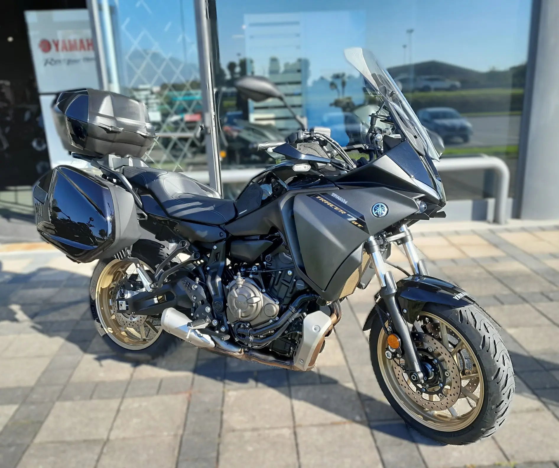 Yamaha Tracer 7 GT 2024, allestito con sella confort, valigie laterali, cupolino touring e bauletto centrale.