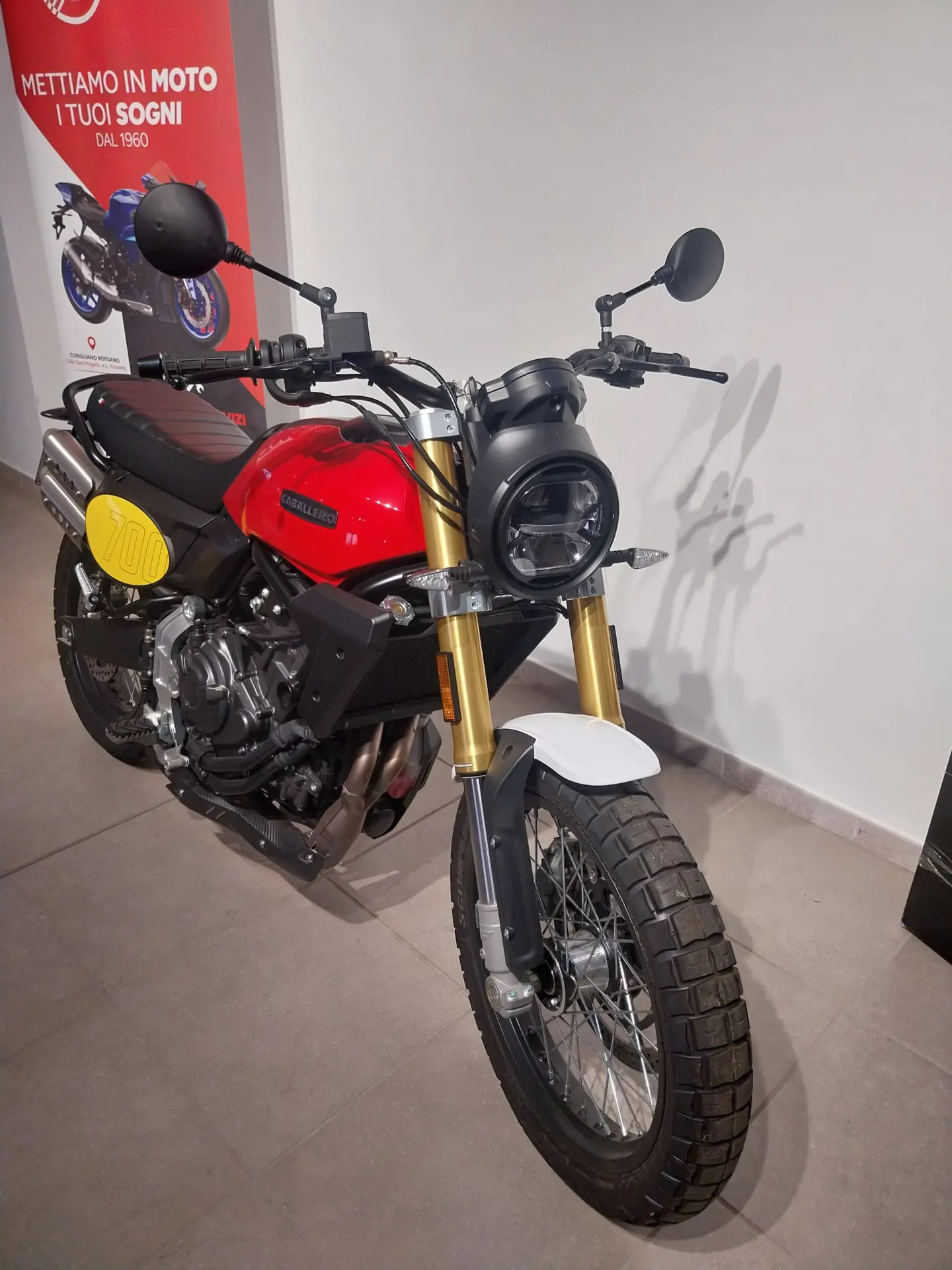 La Caballero 700 è una classica Scrambler, come vanno di moda in questi anni. Linea retrò, ma contenuti tecnici assolutamente moderni. Sfoggia un piccolo ma potente faro a LED con luce diurna DRL, cruscotto rotondo con schermo TFT da 3.5” in grado di connettersi via bluetooth al cellulare e piattaforma inerziale che ha permesso di avere ABS e controllo di trazione cornering.