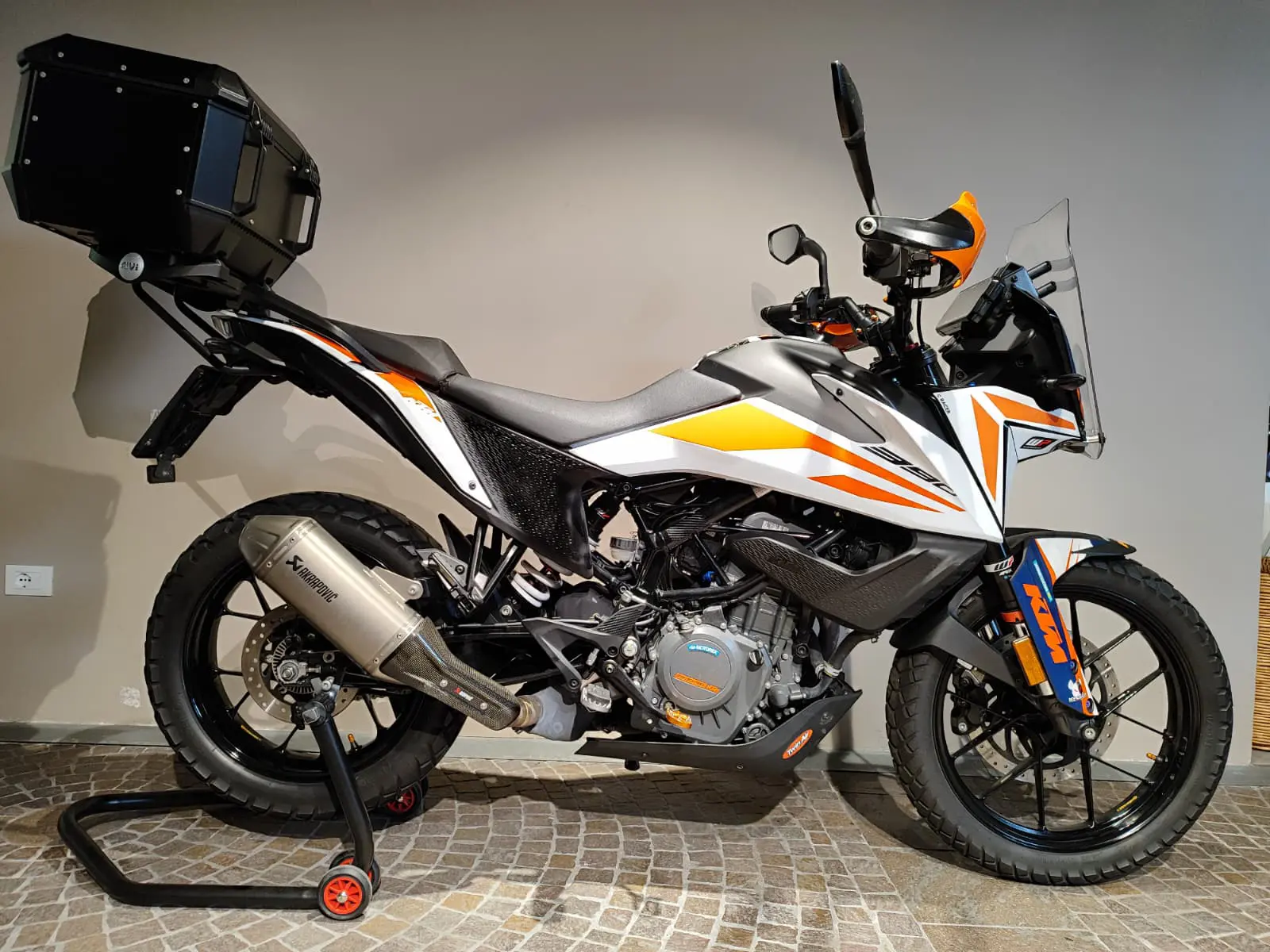 La moto monta scarico Akrpovic, bauletto in alluminio GIVI, kit grafiche + cupolino.