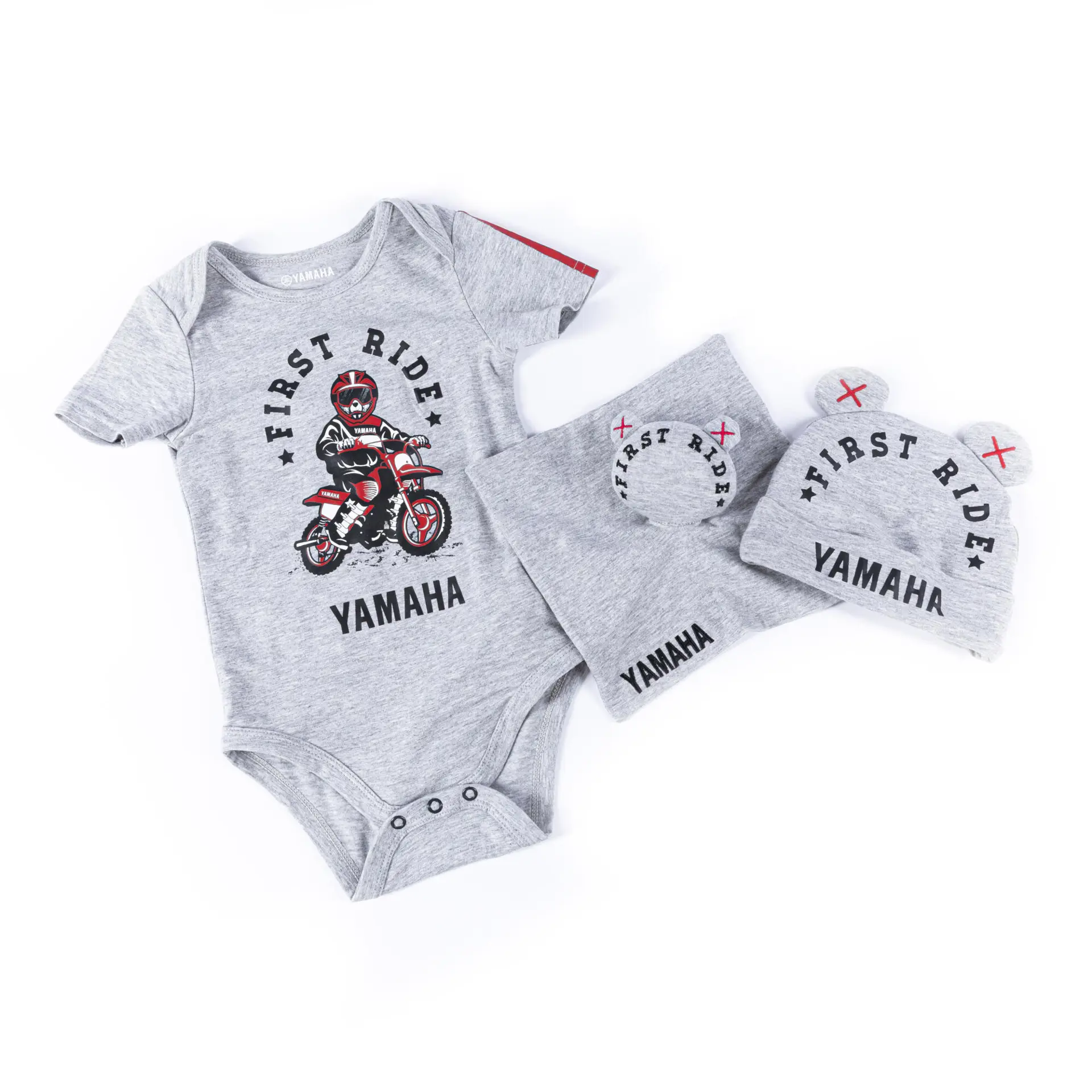 Mostra la passione per Yamaha con la confezione regalo REVS per bambini. Contiene un body grigio, un cappellino e un morbido peluche, i bambini da 1-18 mesi ne apprezzeranno il comfort. Il body presenta il disegno di un cartone "First Steps" e una stampa Yamaha sul petto. I loghi Yamaha sono presenti anche sul cappellino e sul giocattolo. Le maniche corte sono caratterizzate da un'iconica striscia rossa REVS, con chiusure con bottoni automatici sulle gambe per cambiare il bimbo rapidamente e farlo sentire comodo.