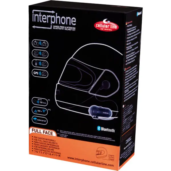nterphone Bluetooth Full Face - per caschi integrali'' è una confezione per un casco integrale.È un interfono driver/passeggero e/o moto/moto( per questa modalità sono richiesti due kit ''Interphone Bluetooth Full Face - per caschi integrali''). Può essere montato su qualsiasi casco integrale e può facilmente essere spostato da un casco all’altro. È senza fili e totalmente impermeabile. Comunica su un canale criptato con qualsiasi altro casco dotato di INTERPHONE in un raggio di 500 mt in campo aperto. È un Viva Voce per telefoni cellulari .È compatibile con qualsiasi telefono dotato di tecnologia Bluetooth. Grazie al filtro DSP e al pop antivento, garantisce conversazioni ottimali anche ad alta velocità. E' configurabile con navigatori compatibili GPS per la ricezione delle informazioni di navigazione.